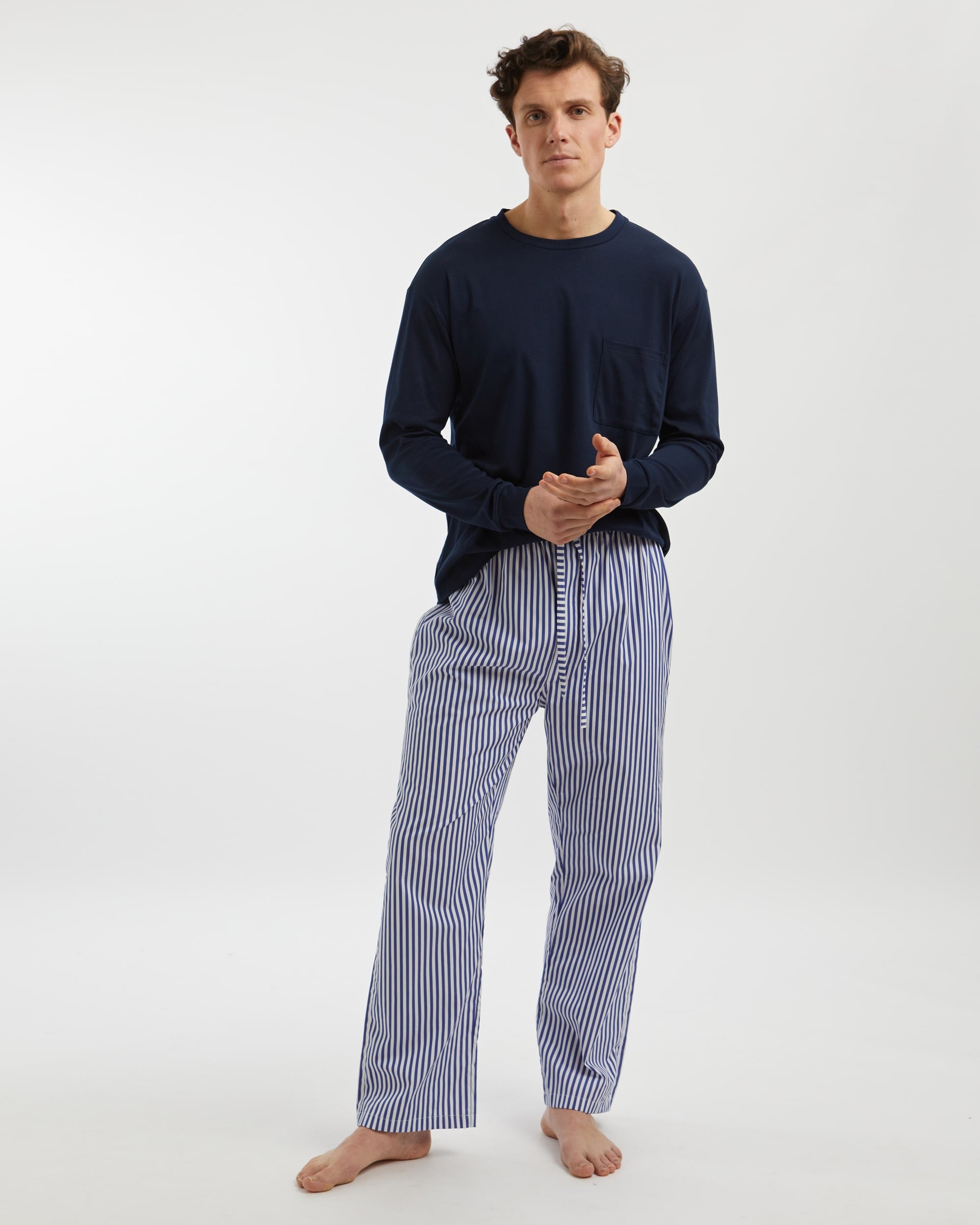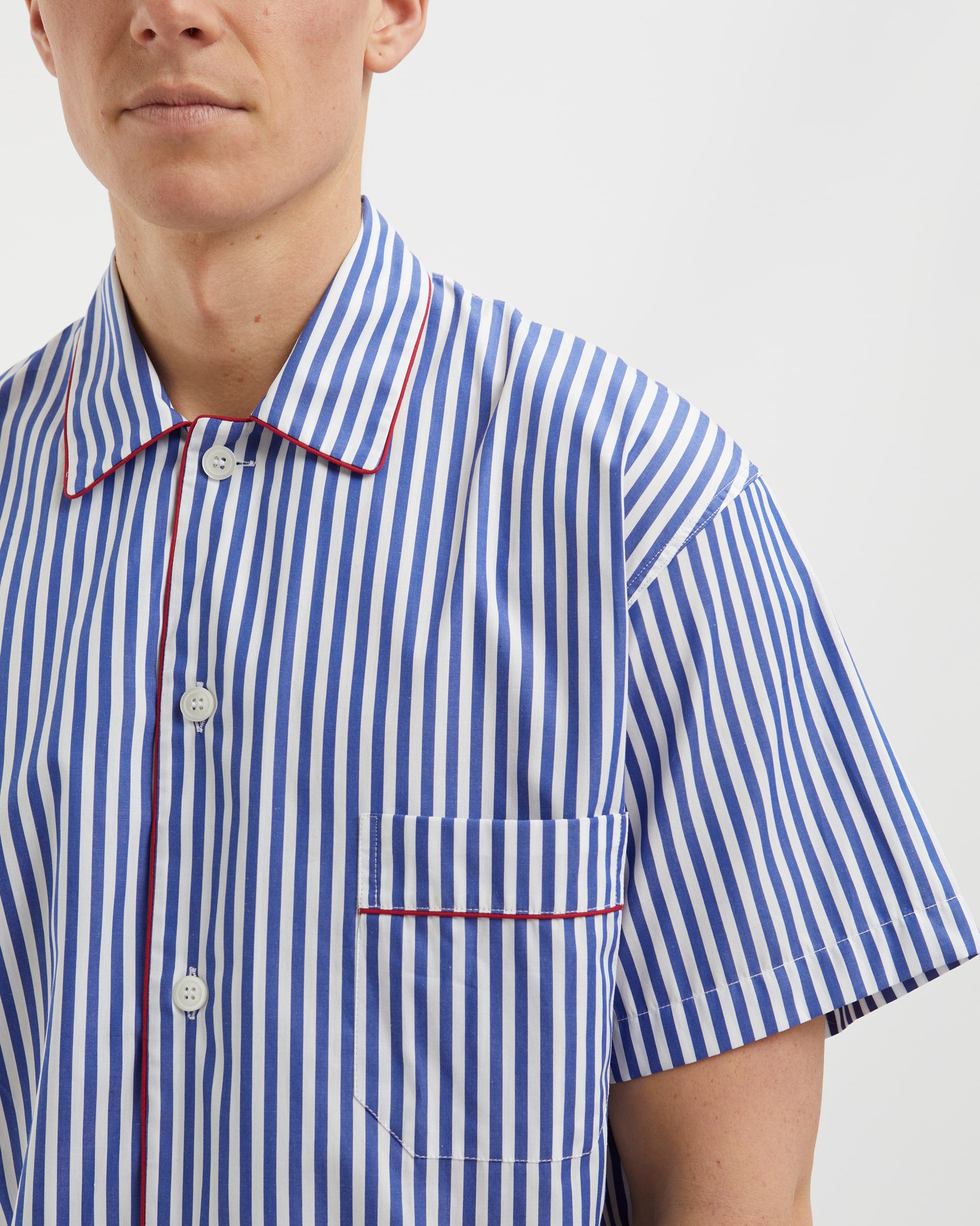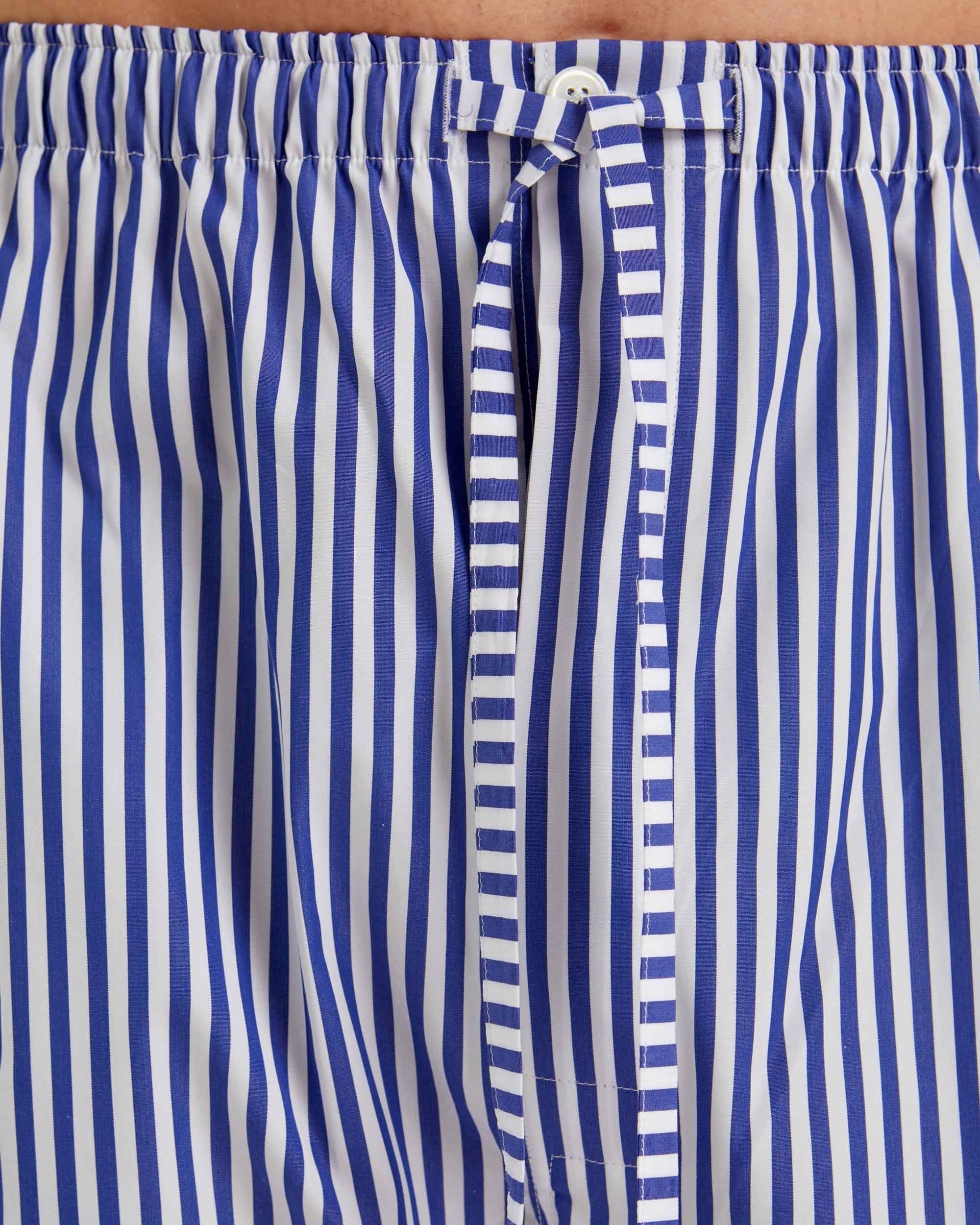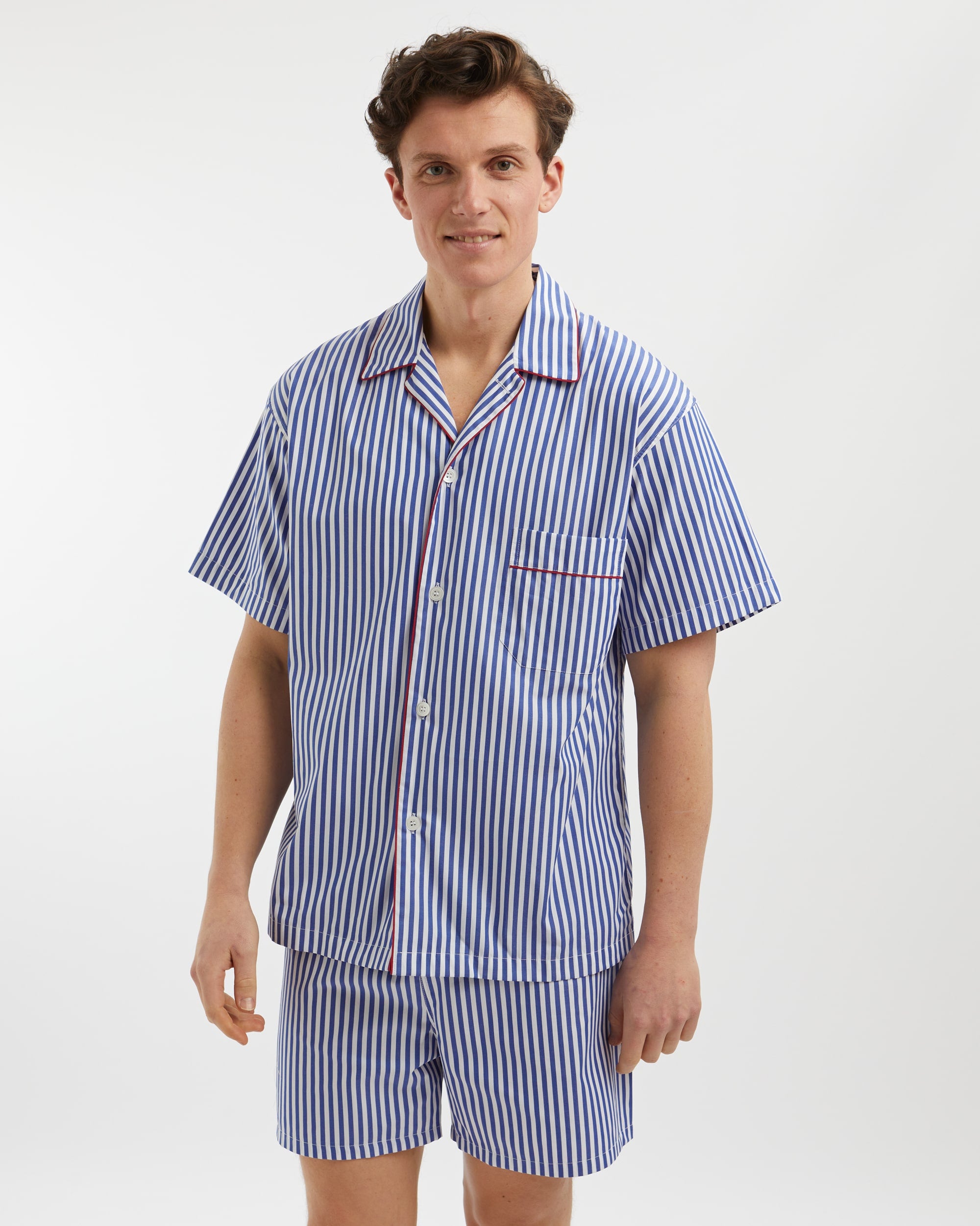 Crafted from a smooth 100% woven cotton for the ultimate in style and comfort, our short men's pyjamas in navy and white stripe with red-piping are a spring-summer must-have.
