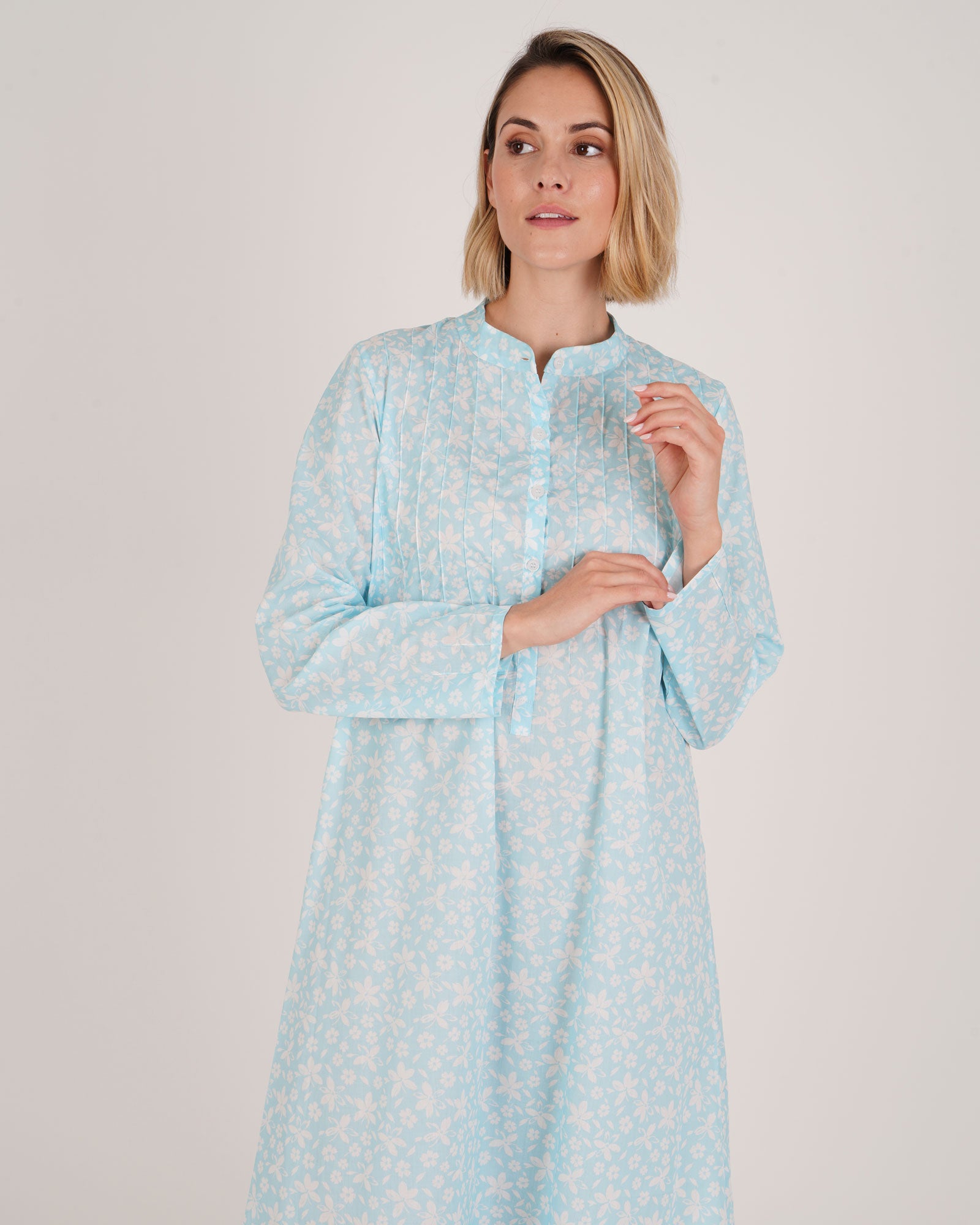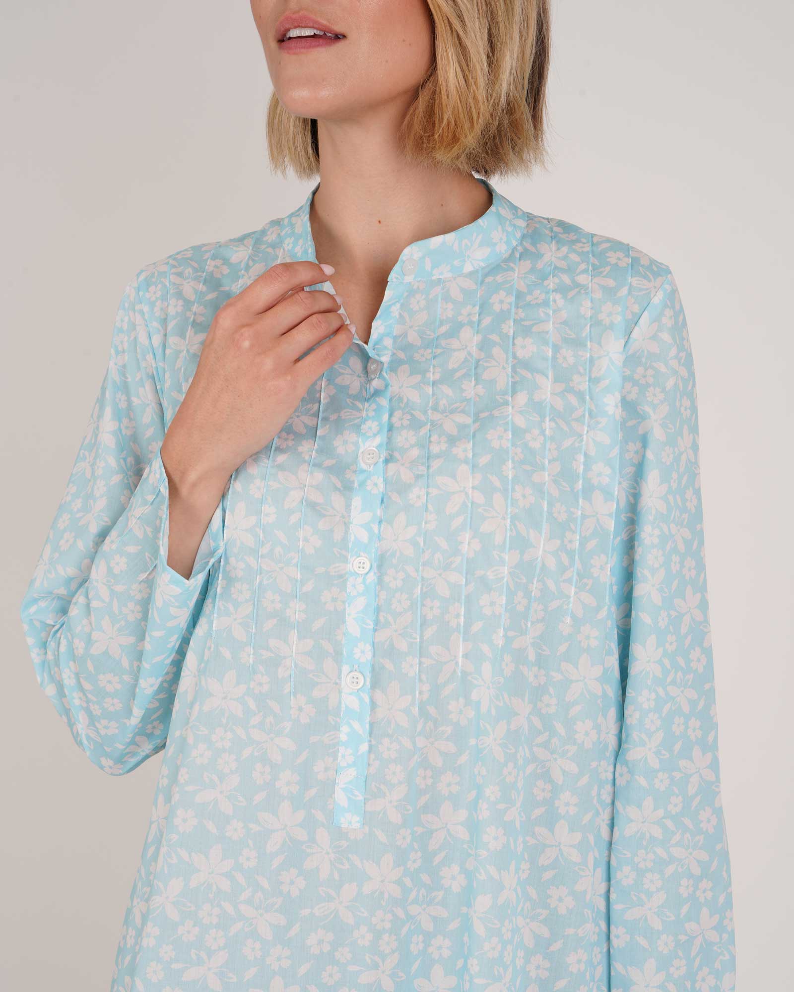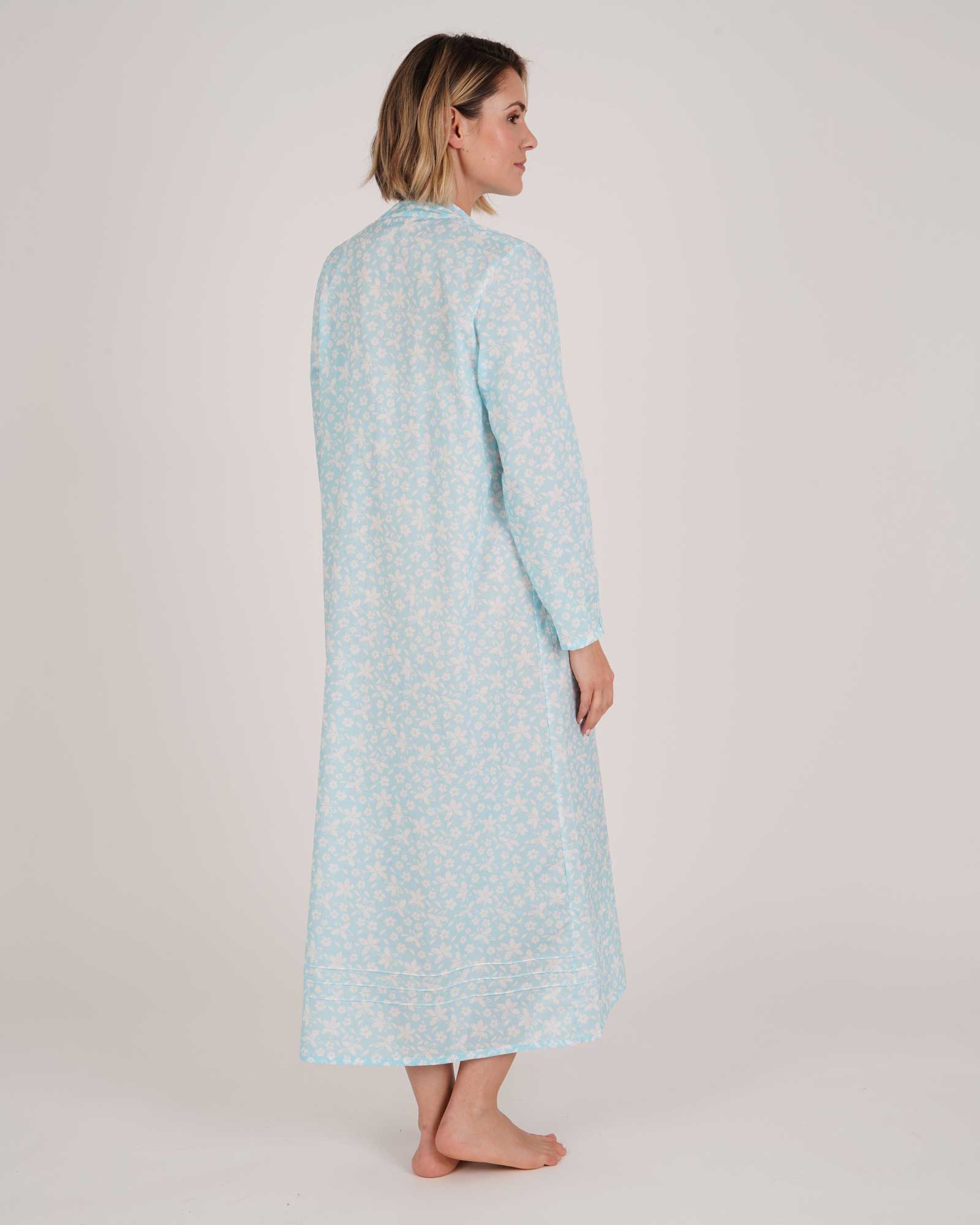 Our Victoria Long-Sleeved Cotton Nightdress in our new Everley Floral print in blue is elegance and comfort combined. The perfect pairing for luxury sleepwear.