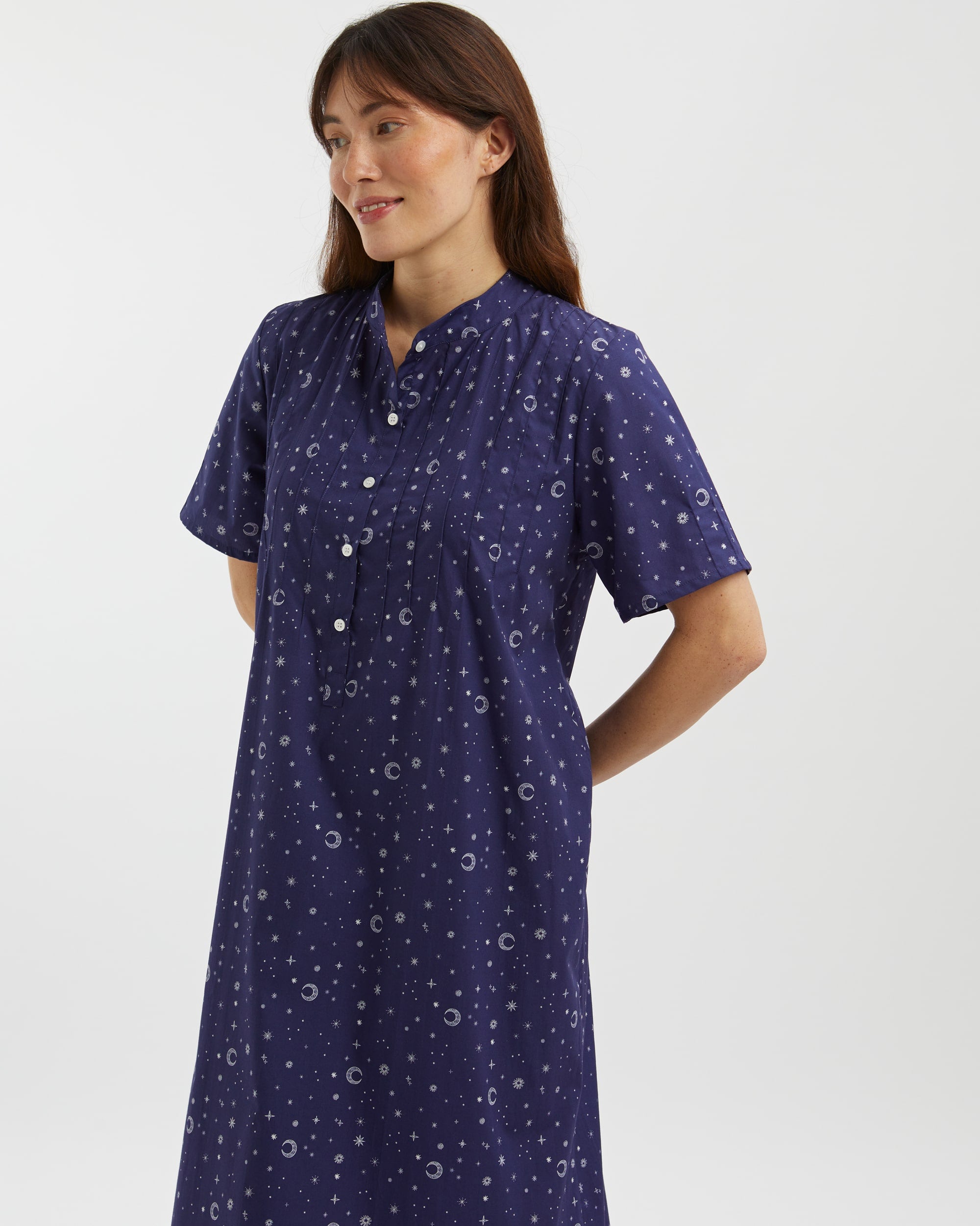 Our Victoria Short-Sleeved Cotton Nightdress in our navy blue celestial print is elegance and comfort combined, the perfect pairing for luxury sleepwear.