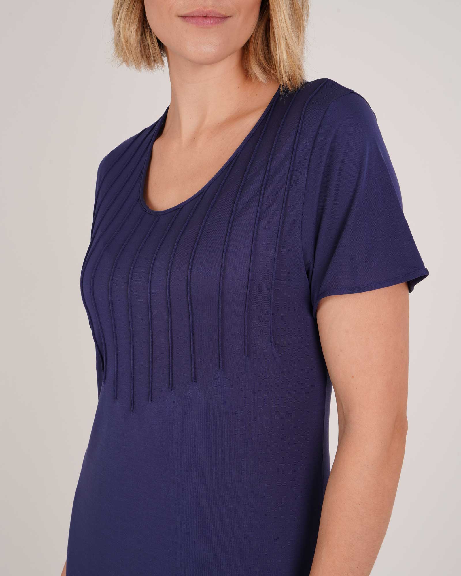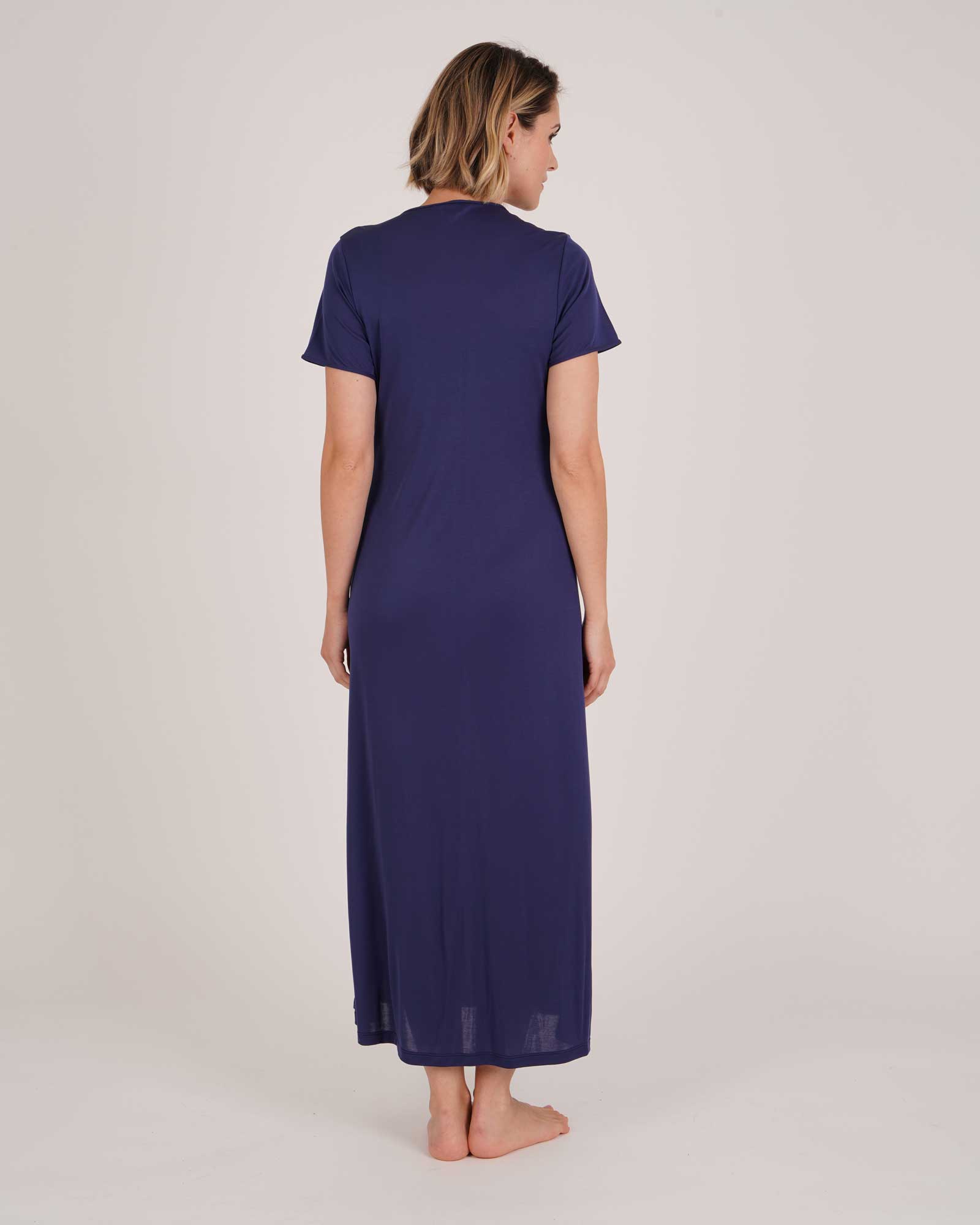 Discover our jersey nightdress in navy blue with delicate ivory lace. Cut for a flattering fit, this jersey nightdress drapes to mid-calf length and features feminine short sleeves, perfect for cosy autumnal evenings.