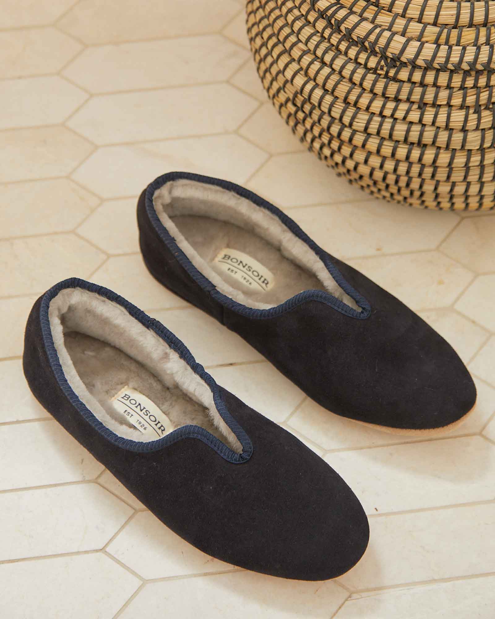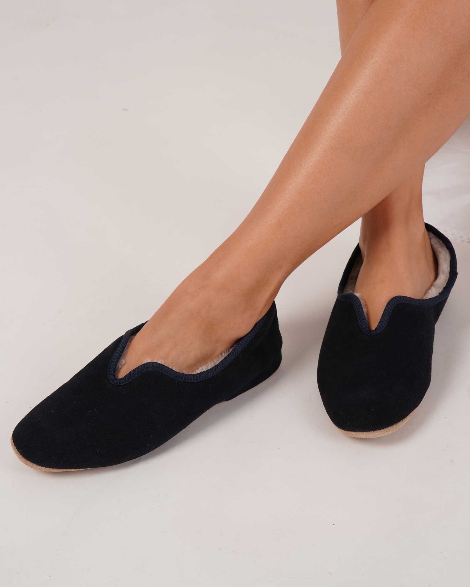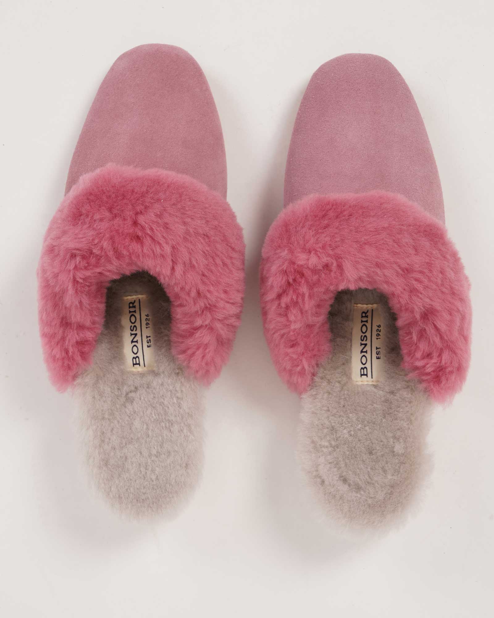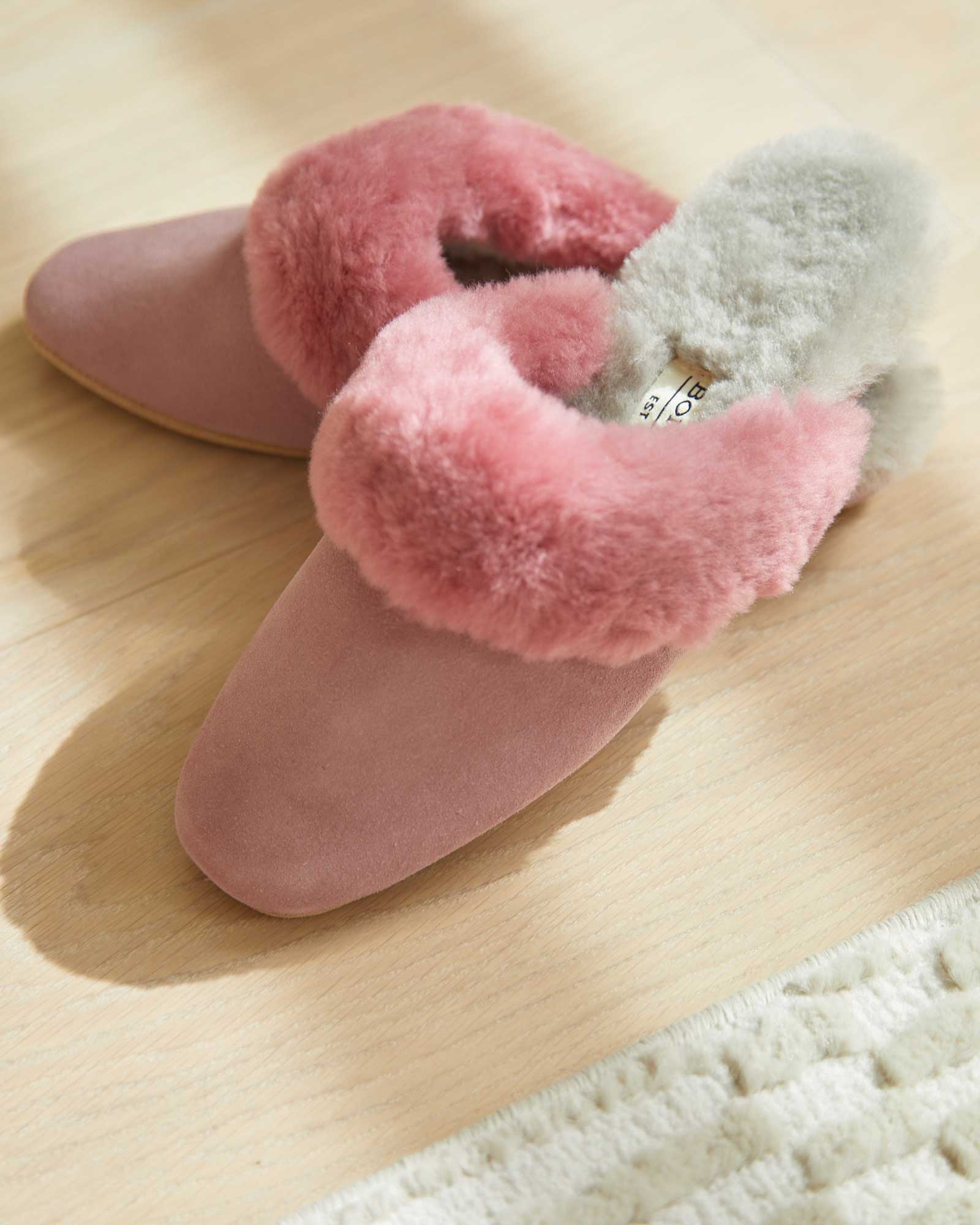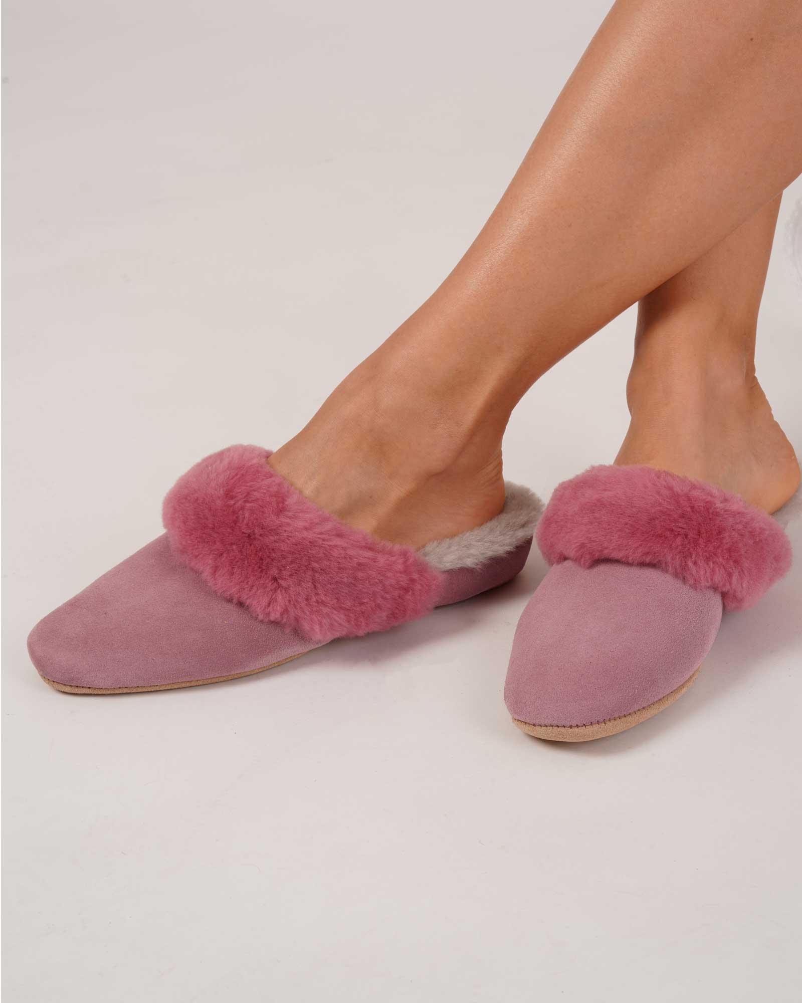 Indulge in the perfect balance of sophistication and coziness with our new Liza Sheepskin Slippers. Made in England with supple suede soles for flexibility and comfort, these slippers boast a luxurious suede upper, plush sheepskin lining, and refined sheepskin collar. Elevated by a 1 1/2 inch wedge heel, these English-made mules exude style and warmth.