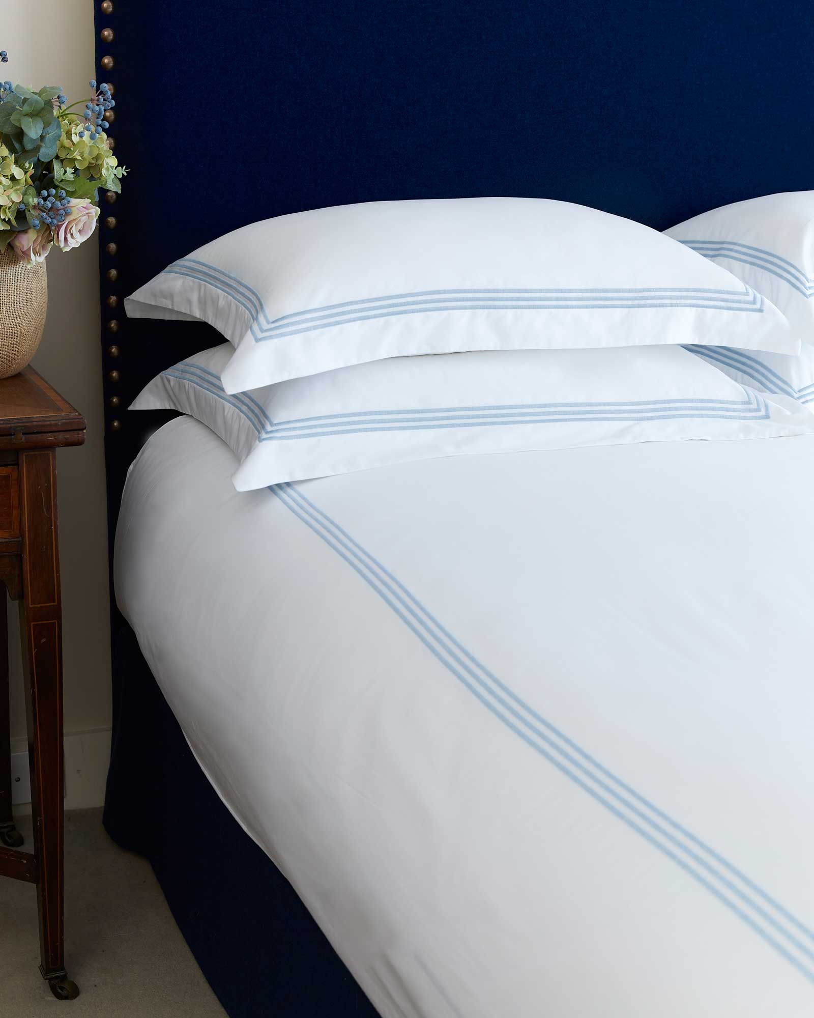 Add a sense of serene refinement to your bedroom with this beautifully embroidered bedding set, featuring a classic triple stripe in gentle light blue. Made in Portugal from 300 thread count cotton with a sateen finish, the set includes a duvet cover and two pillowcases designed to offer a luxurious feel and a crisp, tailored look. Light, breathable, and effortlessly elegant it's the perfect way to refresh your bed for the season ahead.