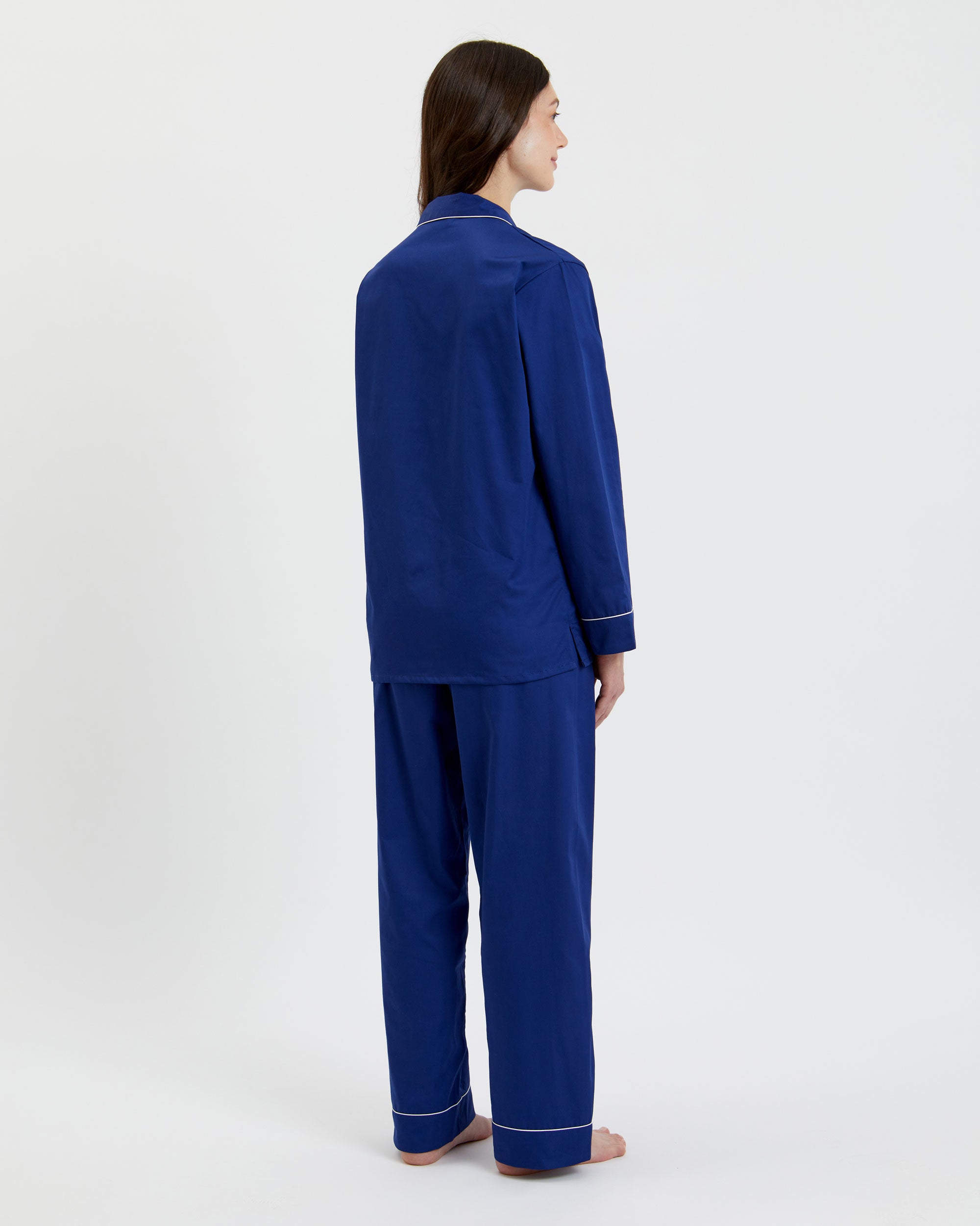 Our luxury sleepwear is the epitome of elegance. Crafted from 100% cotton, our pyjama sets have a relaxed fit and feature a half elastic, half self-fabric drawstring waist. Navy sateen is finished with white piping for a refined result.