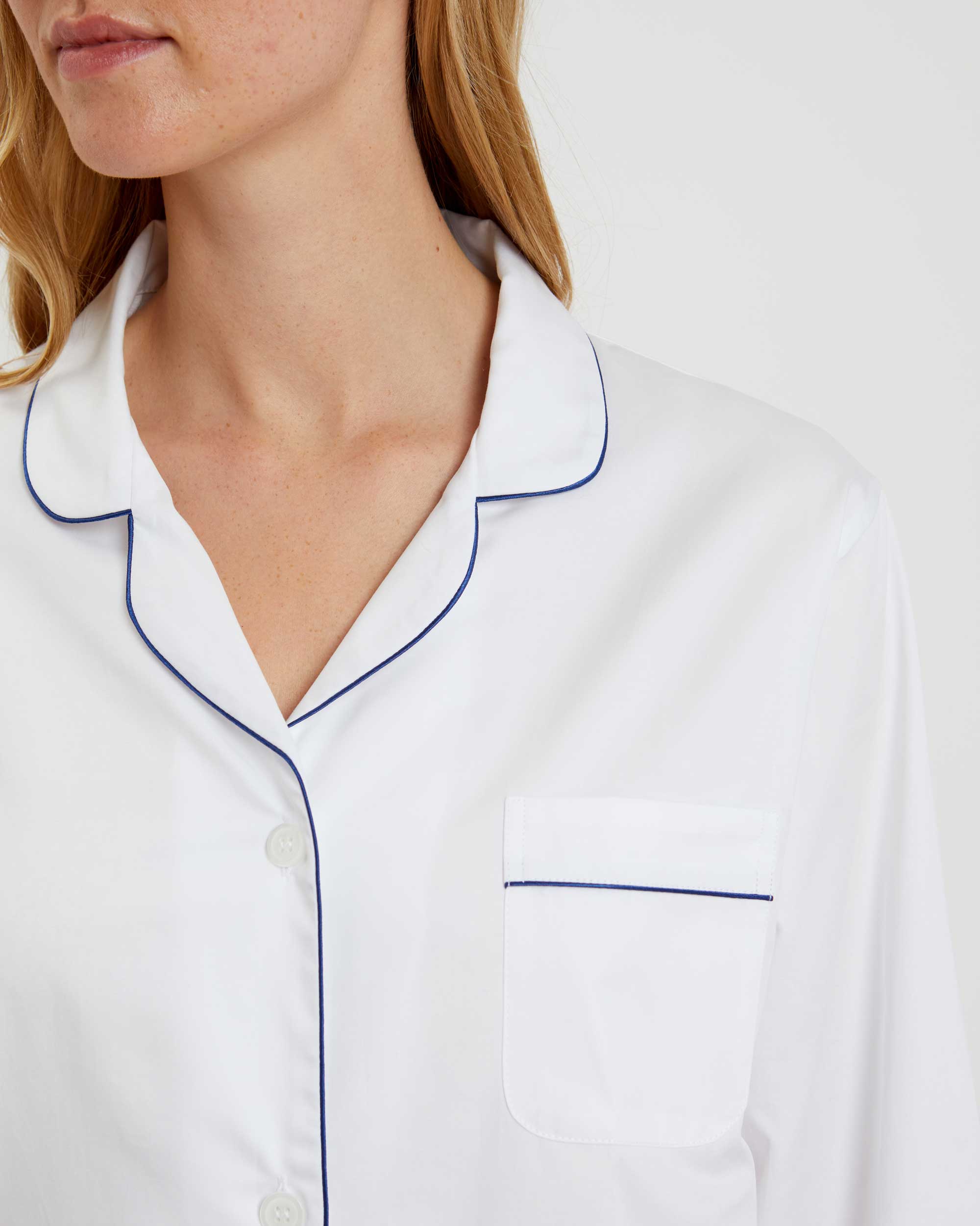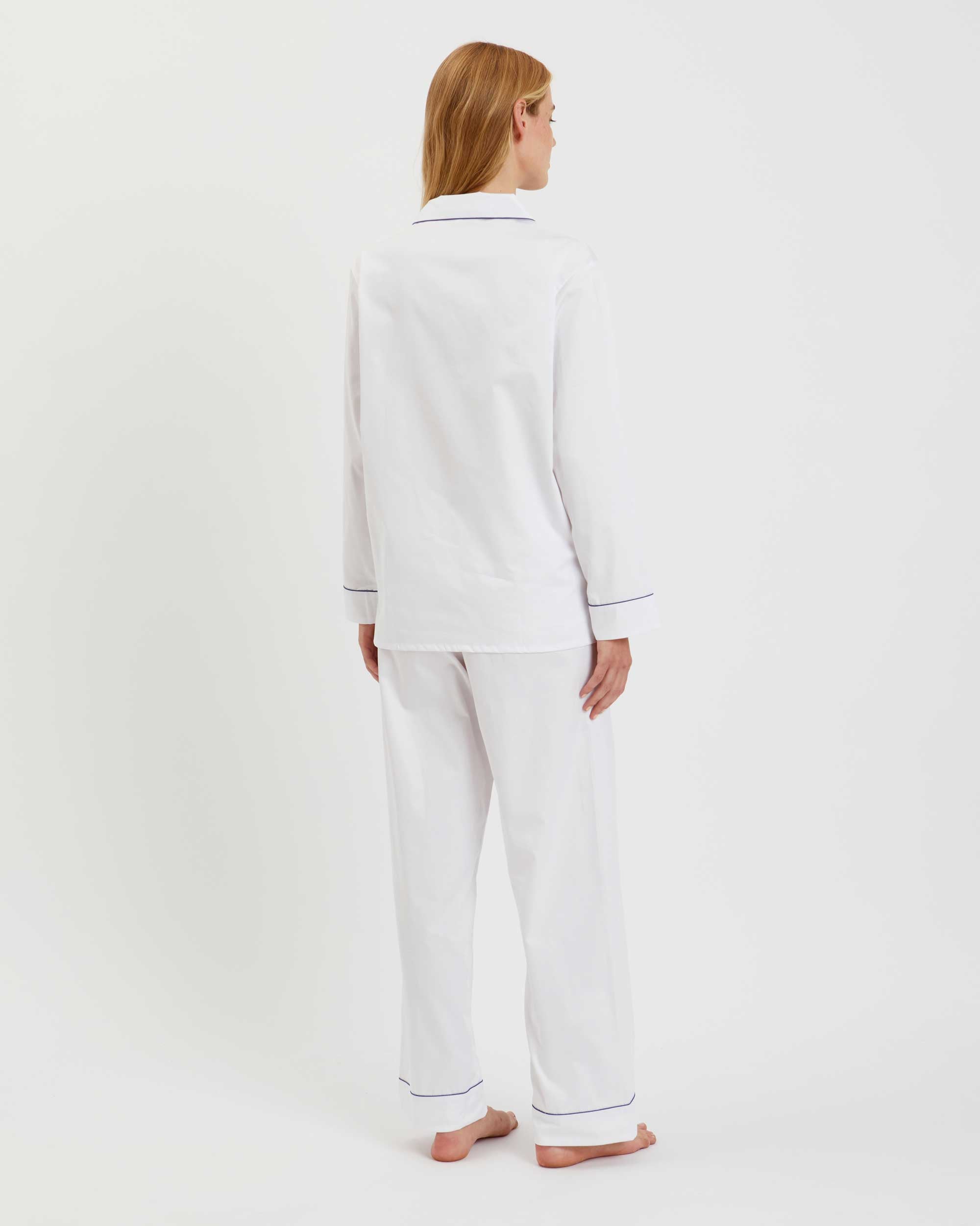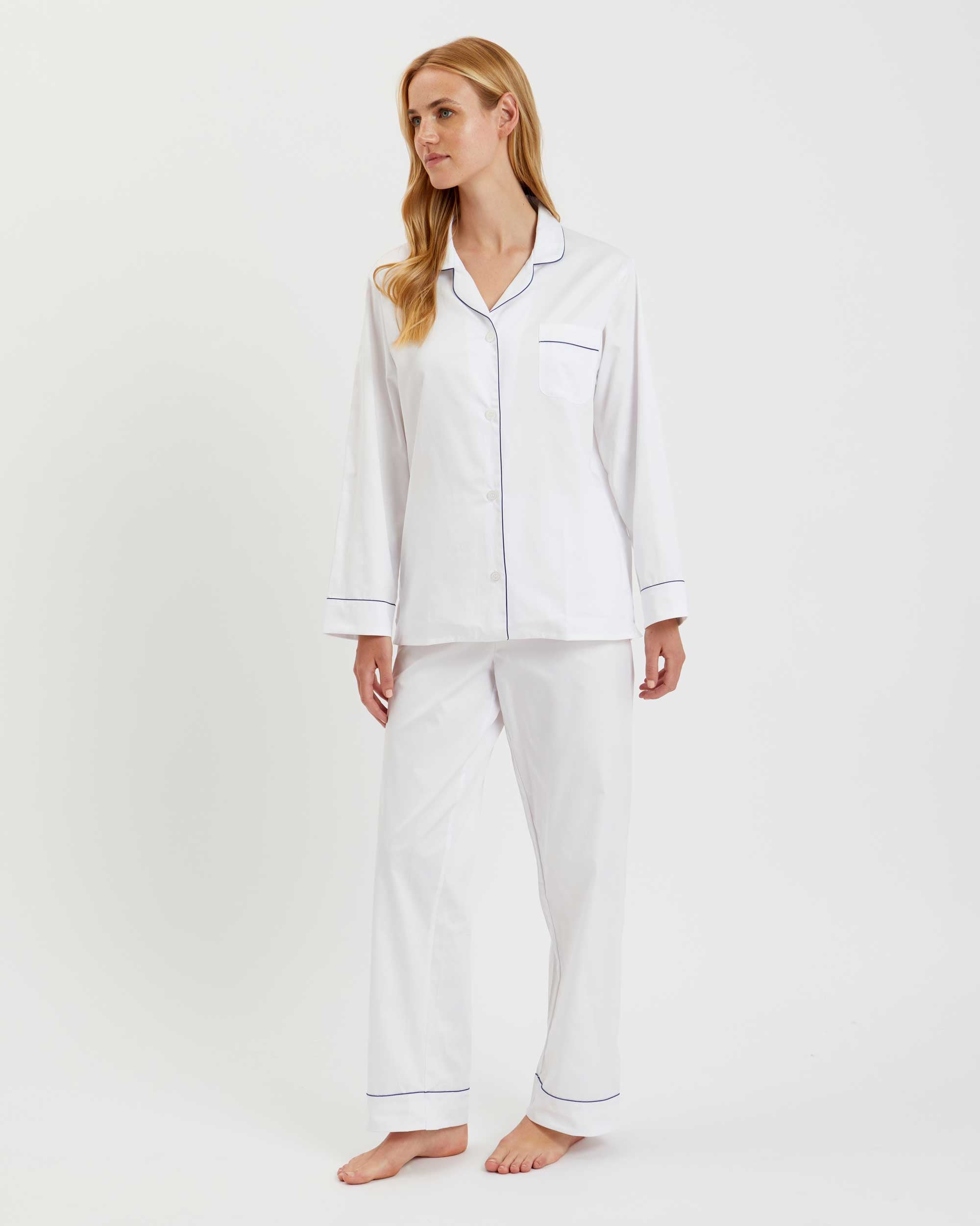 Our luxury sleepwear is the epitome of elegance. Crafted from 100% cotton, our pyjama sets have a relaxed fit and feature a half elastic, half self-fabric drawstring waist. White sateen is finished with navy piping for a refined result.