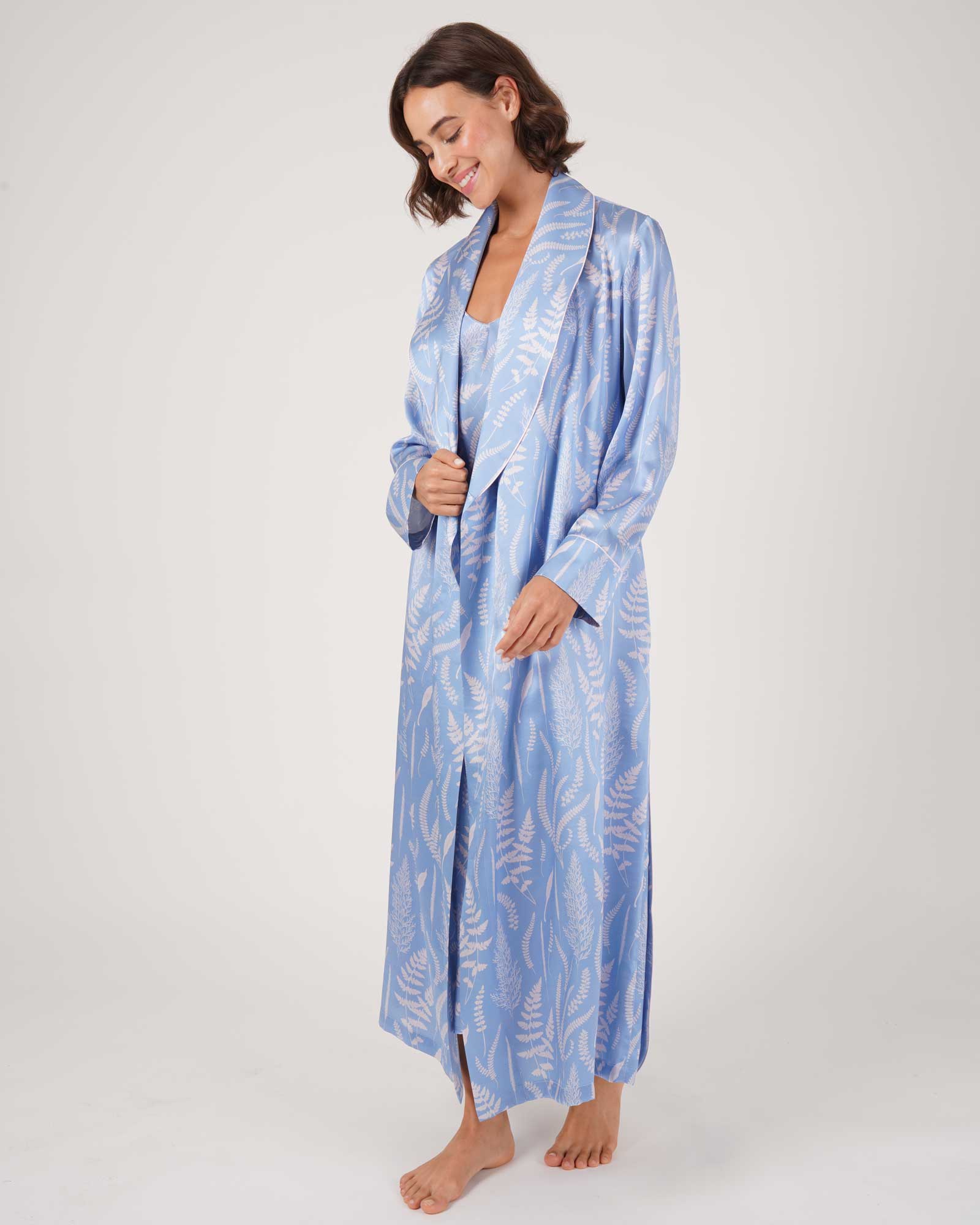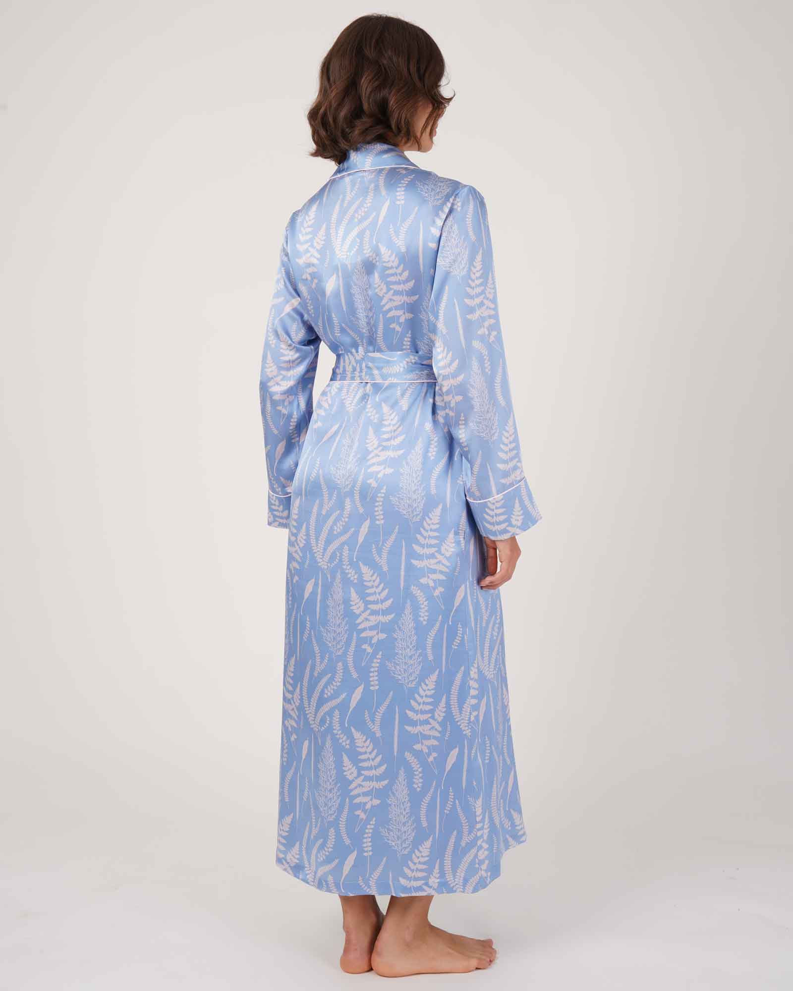 Made from 100% silk satin in a luxurious 19 momme weight, this piece envelops you in everyday luxury with its elegant shawl collar and generous wide tie belt. Cut to a flattering mid-calf length, it features self-fabric pockets discreetly concealed in the side seams and inside ties for added comfort and ease. This is luxury loungewear at its finest.